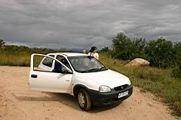 Denn nach einer guten Stunde hieß es wieder einsteigen und Weiterflug nach Johannesburg unserem eigentlichen Reiseziel. Der kurze Flug von 11:30 bis 13:00 war auch schnell um - das Wetter in Süd Afrika denkbar schlecht - es regnete. Zum Glück waren wir flexibel - denn wir hatten uns unseren Rundreise-Plan nur grob abgesteckt und sollte das Wetter nicht passen war die Route schnell änderbar. Eine Stunde vertrödelten wir am Airport - um Geld zu tauschen. Es galt die 4-5 Wechselstuben abzuklappern und den optimalen Kurs incl. Gebühren zu ermitteln. Danach rechneten wir mit einer Umtauschrate von 7,7 RAND(R) = 1 Euro. Den Mietwagen bekamen wir schnell und unkompliziert bei Europcar. Dafür hatte ich zuvor ausgiebig im Netz recherchiert - da es nicht so einfach war einen Mietwagen nach Zimbabwe, Botswana und Namibia zu nehmen. Zuvor wollte ich eigentlich auch noch die Genehmigung nach Mosambik - aber das wäre dann doch zu teuer geworden. Jeder Vermieter hat andere Bedingungen und Gebühren - die weltweit bekannten (Avis, Hertz, Europcar, Budget sowie Reseller wie Holiday-Autos und FTI Touristik) waren teilweise unverschämt teuer auch LTUR langte ordentlich zu. So landete ich schließlich bei etwas billig aussehenden Webseiten die plötzlich ohne Gebühren zu superguten Konditionen ohne Selbstbeteiligung im Schadensfall genau das anboten was ich brauchte. Hier der Link RAV Rent a Vehicle: Car Rental / South Africa. Ich reservierte die kleinste Kategorie - die sich schließlich als Opel - Corsa herausstellte für 226 Rand/Tag. Darin enthalten waren unlimitierte Kilometer ohne Selbstbeteiligung und die Erlaubnis nach Zimbabwe, Botswana & Namibia fahren zu dürfen (Cross Border Fee). Also cruisen für weniger als 30 Euro/Tag mit Kassettenradio im höher gelegten Opel Corsa - wenn das nichts ist. Kilometerstand bei Abnahme 6300km :). Teil 1: Johannesburg - Krüger NationalparkKaum aus dem Flughafengelände raus - begrüßte und ein verregneter Nachmittag. Ich drehte meine ersten Runden (Linksverkehr!) durch Johannesburg - was aber dank der Karte von Europcar unproblematisch war.23.03.2005 Erstmal frühstücken und shoppen. Dafür sind wir zur "Riverside Mall" in Nelspruit gefahren und dort gab es dann Shop an Shop. Eine Campinggaskartusche mit Schraubverschluss lies sich trotzdem partout nicht auftreiben - aber Brötchen, Käse und Ketschup waren kein Problem sowie eine lange Hose für Tomomi (29Rand). Noch einige Konserven und Nudelpackungen sowie Bier aus dem Liquerstore und 3 Kanister Trinkwasser vervollständigten unseren Vorrat. Benzin kostete übrigens zw. 4,1 und 4,9 Rand pro Liter also ca. 0,6 Euro :)). ![]()