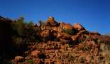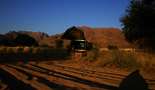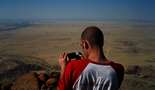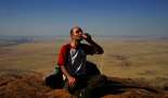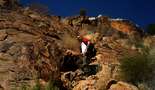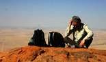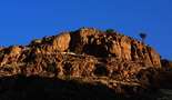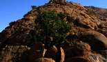 Nach der Feierei gestern abend fiel das aufstehen zuerst etwas schwer... aber das Panorama direkt vor uns mit dem morgentlichen Sonnenlicht auf dem Brandberg war einfach Wahnsinn. Ich war gar nicht mehr müde und nach der allmorgentlichen Outdoor shower und Müsli gings los. Wir hatten vor den Brandberg zu besteigen. Nicht wirklich vorbereitet aber immerhin schon etwas besser geplant als beim ersten Besteigungsversuch vor 4 Jahren (Afrika 2005) fuhren wir mit dem Geländewagen querfeldein noch ein bischen näher ran. Und parkten neben einem markanten Steinhaufen direkt am Fuß der letzten Brandbergausläufer. Einer Eingebung folgend speicherte ich die aktuellen Koordinaten im GPS unseres Garmins und packte das Ding ausgeschaltet zusammen mit unseren Stirnlampen in den Rucksack. Als Proviant nahmen wir jeweils 1,5l Wasser, ne Dose Cola und Redbull sowie Bananen und einige Snickers mit. Ich schleppte dazu noch die zwei Kameras und eine Fließjacke weil es doch recht kalt war.