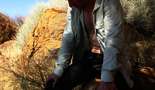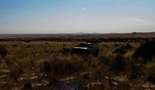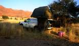 Erschreckt mussten wir feststellen das wir in der Dunkelheit unseren Geländewagen nicht mehr fanden. Auch der vorher so markante Steinhaufen war im dunkeln nicht mehr zu identifizieren. Wir stolperten von einem Steinhäufchen zum nächsten - aber wir fanden unser Auto nicht mehr. Irgendwann fand endlich unser inzwischen eingeschaltetes GPS Gerät wieder die eigenen Koordinaten. Verwundert folgten wir den in einer komplett anderen Richtung angezeigten Zielkoordinate die ich am morgen gespeichert hatte. Je näher wir dem Zielpunkt kamen desto skeptischer wurden wir. Plötzlich trat ich auf etwas weiches und im Schein meiner Stirnlampe stellte ich fest das es eine doch etwas größere Schlange war. Total fertig liefen wir weiter und bei vorsichtigen ausleuchten entdeckten wir regelmäßig Schlangen im kalten Sand. Im Zielpunkt angekommen mussten wir feststellen das die gespeicherten Koordinaten falsch waren. Ich hatte anscheinend am Morgen nicht lange genug gewartet bis das Gerät die aktuelle Position richtig erkannte oder komplett was falsch gemacht. Immerhin fanden wir den Platz wieder an dem wir heute morgen gecampt hatten. Es war stockfinstere Nacht und wir hatten Durst wie Schwein - die Stirnlampen machten langsam schlapp. Wir versuchten den Reifenspuren und umgeknickten Steppengras zu folgen die wir am Morgen beim fahren verursacht hatten. Irgendwie fanden wir dann schließlich unseren Steinhaufen und waren unglaublich dankbar doch noch das Auto gefunden zu haben. Super Stimmung - Biere auf und erstmal Mukke an. Gemächlich fuhr ich mit dem Geländewagen durchs Gestrüpp - einen Weg gab es ja nicht. Irgendwie war aber heute nicht unser Tag - aufgrund der schlechten Sicht - Steppengras bis zum Dach - entschieden wir nicht weiter Offroad zu cruisen. Also an einer relativ geraden Stelle Zelt aufgebaut und erstmal Duschen.