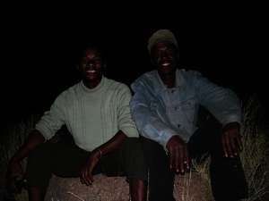 Opps kaum die Dusche klar gemacht sah ich vom Dach des Jeeps zwei Taschenlampen auf uns zuturkeln. Wenig später erreichten uns zwei Guides aus dem Nationalpark die wohl in der Nähe ihr Schlafcamp hatten. Zum Glück waren sie nur neugierig und wollten uns helfen den Weg mit dem Auto aus dem Gebiet zu finden (was wir aber nicht mehr wolten). Also teilten wir unser Bier, Zigaretten und Spagetti mit ihnen und verbrachten den restlichen Abend in Gesellschaft am Lagerfeuer. Als die Typen weg waren gabs dann die Dusche und ab ins Bett.