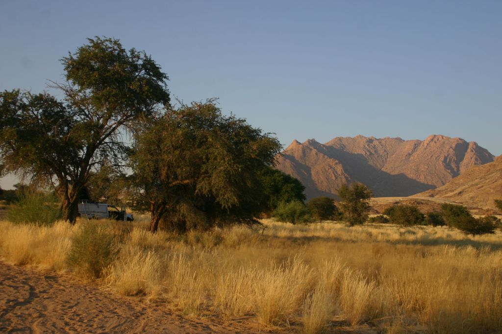 Nach der Feierei gestern abend fiel das aufstehen zuerst etwas schwer... aber das Panorama direkt vor uns mit dem morgentlichen Sonnenlicht auf dem Brandberg war einfach Wahnsinn. Ich war gar nicht mehr müde und nach der allmorgentlichen Outdoor shower und Müsli gings los. Wir hatten vor den Brandberg zu besteigen. Nicht wirklich vorbereitet aber immerhin schon etwas besser geplant als beim ersten Besteigungsversuch vor 4 Jahren (Afrika 2005) fuhren wir mit dem Geländewagen querfeldein noch ein bischen näher ran. Und parkten neben einem markanten Steinhaufen direkt am Fuß der letzten Brandbergausläufer. Einer Eingebung folgend speicherte ich die aktuellen Koordinaten im GPS unseres Garmins und packte das Ding ausgeschaltet zusammen mit unseren Stirnlampen in den Rucksack. Als Proviant nahmen wir jeweils 1,5l Wasser, ne Dose Cola und Redbull sowie Bananen und einige Snickers mit. Ich schleppte dazu noch die zwei Kameras und eine Fließjacke weil es doch recht kalt war.