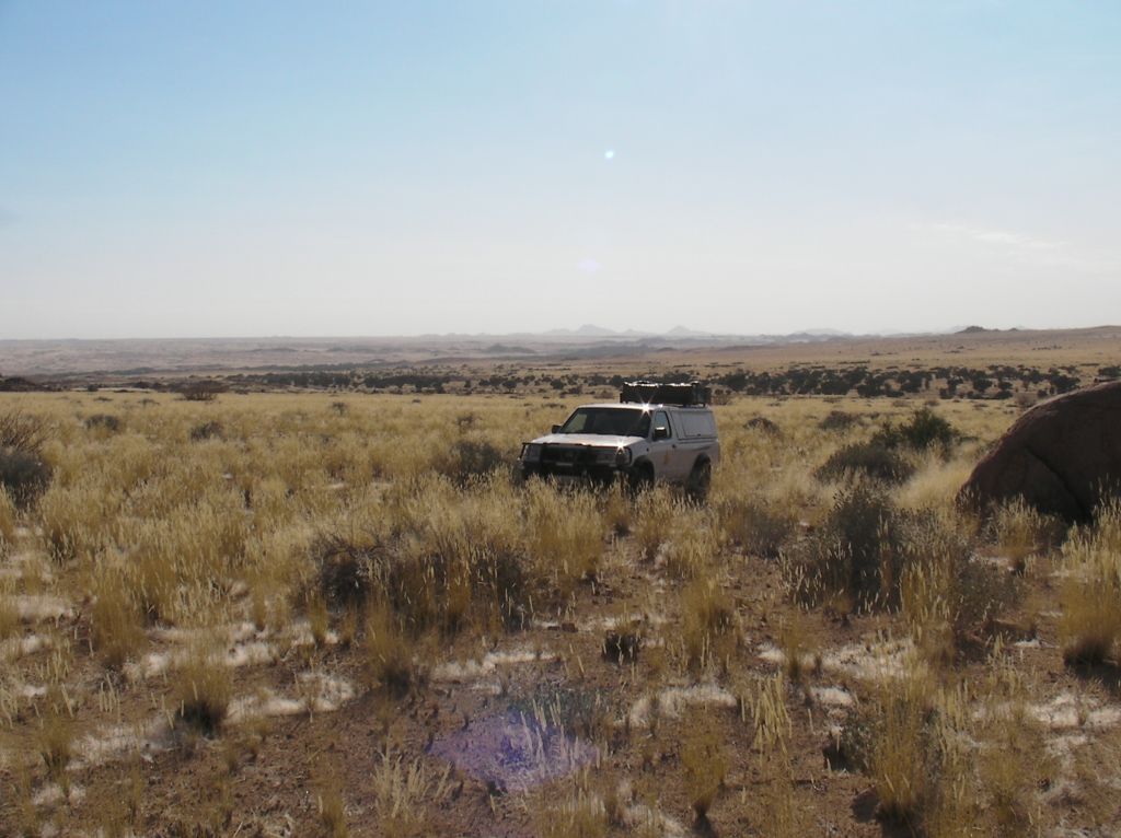 Erschreckt mussten wir feststellen das wir in der Dunkelheit unseren Geländewagen nicht mehr fanden. Auch der vorher so markante Steinhaufen war im dunkeln nicht mehr zu identifizieren. Wir stolperten von einem Steinhäufchen zum nächsten - aber wir fanden unser Auto nicht mehr. Irgendwann fand endlich unser inzwischen eingeschaltetes GPS Gerät wieder die eigenen Koordinaten. Verwundert folgten wir den in einer komplett anderen Richtung angezeigten Zielkoordinate die ich am morgen gespeichert hatte. Je näher wir dem Zielpunkt kamen desto skeptischer wurden wir. Plötzlich trat ich auf etwas weiches und im Schein meiner Stirnlampe stellte ich fest das es eine doch etwas größere Schlange war. Total fertig liefen wir weiter und bei vorsichtigen ausleuchten entdeckten wir regelmäßig Schlangen im kalten Sand. Im Zielpunkt angekommen mussten wir feststellen das die gespeicherten Koordinaten falsch waren. Ich hatte anscheinend am Morgen nicht lange genug gewartet bis das Gerät die aktuelle Position richtig erkannte oder komplett was falsch gemacht. Immerhin fanden wir den Platz wieder an dem wir heute morgen gecampt hatten. Es war stockfinstere Nacht und wir hatten Durst wie Schwein - die Stirnlampen machten langsam schlapp. Wir versuchten den Reifenspuren und umgeknickten Steppengras zu folgen die wir am Morgen beim fahren verursacht hatten. Irgendwie fanden wir dann schließlich unseren Steinhaufen und waren unglaublich dankbar doch noch das Auto gefunden zu haben. Super Stimmung - Biere auf und erstmal Mukke an. Gemächlich fuhr ich mit dem Geländewagen durchs Gestrüpp - einen Weg gab es ja nicht. Irgendwie war aber heute nicht unser Tag - aufgrund der schlechten Sicht - Steppengras bis zum Dach - entschieden wir nicht weiter Offroad zu cruisen. Also an einer relativ geraden Stelle Zelt aufgebaut und erstmal Duschen.