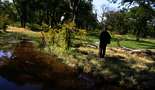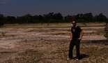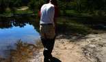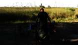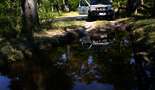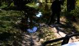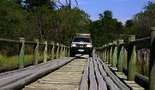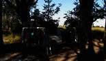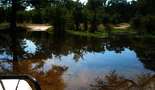 Später kommt uns ein Jeep entgegen und rät uns umzukehren, weil es tiefe Wasserlöcher gibt. "You won't make it". Aber wir lassen uns nicht beirren und unser Ehrgeiz ist geweckt. Ein paar Kilometer später kommen wir an ein scheinbar tiefes Wasserloch an dem wir 1h Stunde beratschlagen und austesten. Schmeisse wadet sogar mit zwei umgebundenen Müllsäcken durch, um die Tiefe zu testen. (Die Müllsäcke hab ich blos an weil Marcus mir immer von irgendwelchen Insekten Angst macht die sich angeblich durch die Fußsohlen boren usw.). Schließlich fahren wir mit viel Anlauf durch und zelebrieren das ganze auf Video. Wir klatschen ab und schreien vor Freude. Wenig später wartet bereits die nächste Wasserdurchquerung auf uns - auch diesmal verloren wir einiges an Zeit um die Lage zu checken. Am Nachmittag beim 2. Bier baut Schmeissi dann Mist. Eins der vielen Wasserlöcher auf dem Weg hatte ich falsch eingeschätzt und wegen unserer Sprittsparphobie waren wir nur im 2-Wheel Modus. Irgendwie war der Radius um das verschlammte Wasserloch zu klein und mir rutschte der Jeep hinten Weg rein ins 5m durchmessende Loch. Irgendwie schafften wir es dann aber doch durch viel Feuerholz unter den Rädern und langem hin und herruckeln (mit der Kupplung AuAuauuu) rauszukommen.