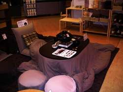 Um im einzigen bewohnten Zimmer so etwas wie Gemütlichkeit zu erzeugen haben die Japaner den „Kotazu“ erfunden – siehe Foto. Ein Tisch unter dem ein Elektroheizung installiert ist und darüber wird eine große Decke gelegt und erneut eine Tischplatte darüber. So sitz man dann mit den Beinen unter dem Tisch abends gemütlich beisammen. Wir haben aus Platzgründen leider keinen Kotatzu aufgebaut - dort steht jetzt dafür BuChans Laufgitter.