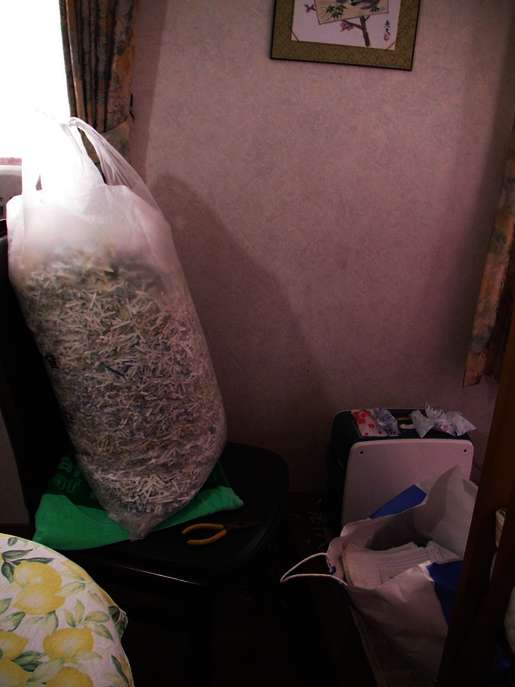So dann nur zum Abschied (des Tagesberichts) - meine heutige Nebentätigkeit kurz vorgestellt (neben der Kinderbetreuung): Akten schreddern da ja Tomomis Eltern vor 2 Jahren Ihre Fabrik verkauft hatten gab´s und gibt’s noch jede Menge Belege was weg muss. Verbrennen darf ich die Regalmeter nicht – nur schreddern – und das mach ich heute damit wieder ein halber Quadratmeter Platz frei wird. Zwei Säcke hab ich schon - leider überhitzt trotz Kühlakkus der Reißwolf andauernd und ich muss immer mal ne Zwangspause machen – in der ich den Bericht schreiben kann.