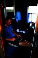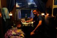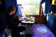 Da wir noch 30 Minuten Zeit bis zur Abfahrt unseres Zuges haben, begibt sich Marcus noch einmal zum Bahnhofsverkaufsshop, um weitere Kleinigkeiten, drei Wasserflaschen und ein dunkles Brot, für unsere Reise zu besorgen. Gleich nach Abfahrt erhalten wir eine Tüte mit Bettwäsche und ein Hand- und Geschirrtuch. Glücklich über den reibungslosen Ablauf, genießen wir entspannt die Zugfahrt. Die Kaffeeepause verbringen wir im Speisewagen. Gewappnet und stolz über seine Videobrille versucht Marcus diverse Details und Erfahrungen aufzunehmen. Bei dem Anblick unserer drei russischen, gar ernst schauenden Tischnachbarn erscheint dies mir jedoch nicht ganz geheuer. Nach unserer Bestellung erhalten wir einen Kaffeee mit Zucker. Erst später wissen wir, dass “Cafe bjös Saccara” die Zauberformel für “richtigen Kaffee” – also ohne Zucker - ist. Anstatt einer Trinkschokolade wurde uns übrigens eine Tafel Schokolade auf einem Teller gereicht. Die Bedienung entspricht dabei der bereits vielfach erwähnten russisch forschen Mentalität. Erheitert hat uns der aus dem Laptop erklingende Russentechno. Die restliche Zeit bis zum Abend verbringen wir mit Lesen, Schreiben des Reiseberichtes und dem Erlernen des Schachspiels. Wir genießen einfach die Zeit zu zweit! Im Nachbarabteil schaut ein russisches Kind lautstark seinen Film. Das wollen wir auch! Wir fragen deshalb am Abend beim Zugpersonal nach einem Film. Zunächst dachten wir, dass die Filmwiedergabe zentral für alle Abteile gleich verläuft. Es kann jedoch für jedes eine separate DVD eingelegt werden. Allerdings muss sich Fernbedienung geteilt werden. Da wir selbst keine eigenen Disk mitgenommen hatten, erfreuen wir uns an einem russischen Kindertrickfilm (Belka und Spelka), den uns unser Zugpersonal mit einem Lächeln einlegt.