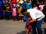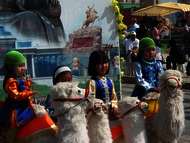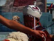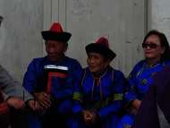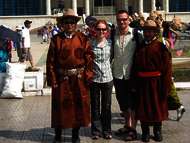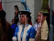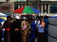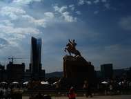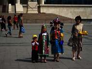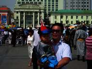 Es ist trocken, staubig, das Thermometer zeigt heiße 33 Grad Celsius und es ist der letzte Tag des Naadamfestes. Eriin Gurwan Naadam - so der vollständige Name - ist das Nationalfest der Mongolen. Es findet jährlich vom 10.-13. Juli statt. Es handelt sich dabei hauptsächlich um eine Sportveranstaltung ähnlich den Olympischen Spielen. Die Mongolen messen sich in den drei traditionellen mongolischen Sportarten: Ringkampf, Bogenschießen und Pferderennen. Die größten Spiele finden in der Hauptstadt statt, aber auch andere Städte feiern die Turniere in kleinerem Umfang. Zum Abschluss findet am letzten Tag ein Kostümumzug auf dem Sukhbaatar Square statt. Das lassen wir uns nicht entgehen und so finden wir uns nach einem fünfzehnminütigen Fußmarsch in Mitten farbenfroh kostümierter und gutgelaunter Mongolen wieder. Es ist schon beachtenswert wie einige Mongolen bei diesen heißen Temperaturen in ihren Fellkleidern in der puren Sonne auf dem Platz marschieren können.