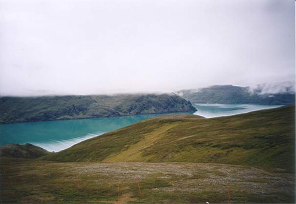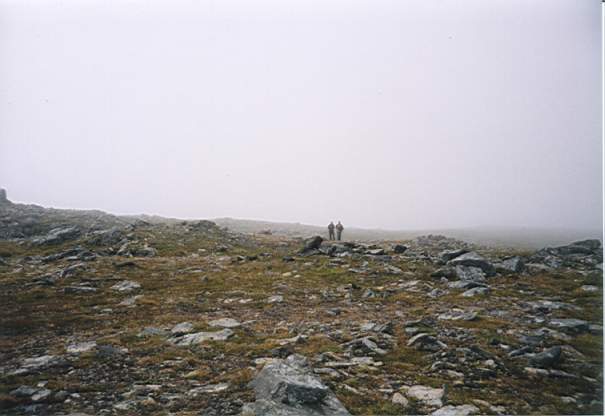 2.Etappe: Zurück.Tag 5 - 9.8.2002 Gegen 8:30 aufgestanden. In den Hüttenbetten hatten alle super geschlafen. Von duschen und kacken bis Frühstück vergingen wenigstens 1:30h. Dann ging's aber los Richtung Knivskjell odden, zum nördlichsten Punkt Europas auf Mageroya. Auto am Fuße des Wanderweges geparkt und los. Es sollten neun Kilometer seien. Die Landschaft war karg, hügelig und steinig (erinnerte an Schweden letztes Jahr). Es gab ein paar Seen, Pfützen, Bäche und morastige Stellen. Nach einer Weile waren unsere Schuhe nass! Nach 1:30h fiel der Wanderweg zur Küste ab, dann ging's nochmal 30 Minuten am Ufer weiter. Rechterhand konnten wir das Nordkap sehen. Nach insgesamt 2:10 waren wir dann da. Ein Stein markierte den Punkt. Dort zogen wir die Schuhe aus und setzten uns erstmal ne Weile hin. Was wir zu essen dabei hatten, wurde gegessen. Fotosession, nach 20 Minuten wieder zurück (wir hatten's eilig). Nochmal anstrengende, kalte, windige 2:15 und aus dem Nebel (vor allem auf dem Rückweg war der übel) tauchten urplötzlich die Umrisse von auf dem Parkplatz geparkten Autos auf. Wir erstmal unser Schwarzbrot alle gemacht (mit Salami und Gurke). Der Wind war inzwischen richtig eklig, eisig und nass - so was hab ich noch nich erlebt.