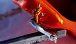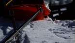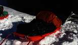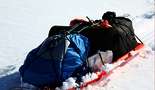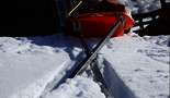 Goldis Konstruktion - ein einfach gekreuztes Gestänge also X - förmig ist augenscheinlich erstmal eine gute Idee. Die Umsetzung auch sehr wertbeständig - das 4?kg schwere Gestänge aus quadratischem Profilmetal ist relativ simpel und passte mit seinen 2m länge auch gerade so noch ins Auto. Die Befestigung am Schlitten war zwar stabil aber leider hatten die Stangen dort zuviel Spiel - ca 5cm und ebenso die Befestigung am Körper. Goldi hatte eine Höhenrettungsweste - mit Schlaufen. Leider war durch die Karabiner Verbindung auch dort ca. 5cm Spiel. Dadurch war es unmöglich mit dem Gestänge dem Schlitten eine Spurt vorzugegen. Der Schlitten rutschte einfach seitlich dahin wo er wollte. Zweites Problem war beim Goldi die Zugweste - dadurch zog Goldi den 50kg schweren Schlitten nicht mit der Hüfte sondern Schulter/Brustkorb. Damit ist es natürlich viel schwerer zu Atmen und sich im Gelände nach oben zu arbeiten. Kostenpunkt 80 Euro - die Weste war geliehen. Nachteil: Nicht klappbar, höheres Gewicht, zuviel Spiel in der aktuellen Konstruktion. Auch Goldi hatte Werkzeug und Ersatzteile mitgenommen.