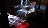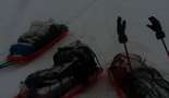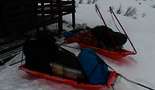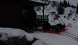 Morgens war das Wetter diesmal noch durchwachsener als gestern mit starkem Wind und leichtem Schneefall. Auf jeden fall lag noch mehr frischer neuer Pulverschnee als Tags zuvor. Tommy hatte bereits wieder ordentlich eingeheizt und mit viel zu heißem Wasser - abgefüllt in 1,5L Flaschen duschte ich das erste mals seit 3 Tagen. Dazu baute ich mir mit der Schlittenwanne und Goldis Plane einen wasserdichten Verschlag im Schlafzimmer und fand das richtig guuuut!