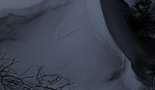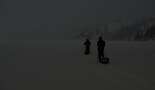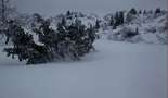 Danach über einen großen zum Glück überfrorenen See ca. 5km schnurgerade nur mit leichten Wellen - dort wo Eisschollen zusammengeschoben waren und es etwas Buckelig war. Da der Wind inkl. Schnee direkt frontal wehte sahen wir zu das es ordentlich voran ging. Es war richtig ekelig. Kaum stoppte man - frohr man erbärmlich durch den starken Wind - nirgends Deckung und beim Ziehen musste man sich ordentlich gegen den Wind lehnen. Nach einer weiteren Stunde hatten wir die 5km geschafft und ein auf der Karte eingezeichnetes Bootshüttchen gab es dann tatsächlich und bot uns Schutz für ne kurze Pause. Müslriegel reingepfiffen und nen Apfel und weiter gings. Nun mussten erneut ca. 100m Höhenunterschied abwärts überbrückt werden. Eine Stunde später standen wir an einer Sackgasse - ein reißender Fluss ca. 4m breit versperrte uns den Weg. Wir scouteten erneut und selbst ohne Schlitten nur mit Schneeschuhen - gabs kein durchkömmen entlang der steilen Talwände - total zugewachsen und fast senkrechte Felsenwände.