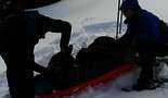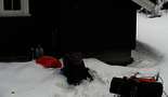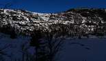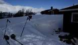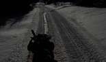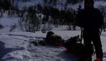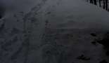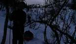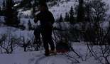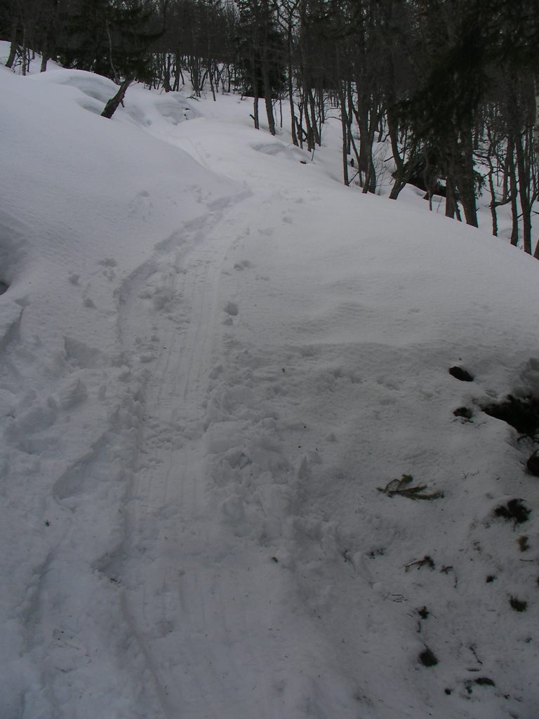 Der Abstieg dann entlang des Flusses durch das Tal war wie erwartet schwierig. jeder entwickelte seine eigene Technik. Ich probierte es mal mit hinter dem Schlitten laufen und den Schlitten vor mir her schiebend bzw. den Hang hinuntergleitend. Aber das war nicht gut - man hat keine Steuerungsmöglichkeit. Am Ende musste ich mit dem Rettungsseil den Schlitten "abseilen". Also doch lieber vor dem Schlitten in üblicher Manier laufen. Irgendwie schaffte ichs dann wider erwarten den schmalen Vorsprung des Wanderweges entlangzulaufen ohne das der Schlitten den Abgang ins Tal machte. Unten dann glücklich angekommen zusammen mit Goldi und Tommy. Tommy hatte die Strategie seine Kraxe aus dem Schlitten auf dem Rücken zu tragen und dann den kaum noch 20kg schweren Schlitten mit Leichtigkeit zu ziehen. Goldi hatte es glaube ich am schwersten und gefährlichsten. Aber alles ging gut. Leider fing es langsam an zu regnen - auf 600m Höhe kein Wunder bei den Temperaturen von 7 Grad. Also spurtet ich 14:30 los die letzten 5km entlang der Straße. Auf der Bücke lag dann sogar noch Schneematsch/Wasser und ich musste nix hinschaufeln und auch den Schlitten nicht abladen.