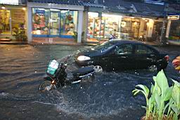 Nach einem „Western Meal“ zahlten wir und wollten uns wieder auf unsere Moped schwingen. Doch der Regen machte uns einen Strich durch die Rechnung. Und wenn es in den Tropen regnet - dann richtig. Wir erlebten die folgenden 30 Minuten ein sehr interessantes Schauspiel. Innerhalb kürzester Zeit war die komplette Strasse zu einem Fluss geworden – und das mitten in der Stadt. Viele Thailänder rannten wild auf der Strasse hin und her, um ihre Moped und fahrenden Verkaufstände vor den Wassermassen zu retten. Immer wenn ein Auto (fast immer Pickups Marke Toyota oder Nissan) den Fluss entlangfuhr, bildeten sich richtige Wellen. |