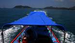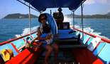 Heute nun Checkout und Fahrt mit Boot nach Koh Taen für 500 THB/ Boot. Da wir A nicht über unser Hotel das Boot gebucht hatten (weil gleich zweimal teurer) und B nicht bis Thong Krut zum "Hafen" fahren wollten hatte ich einige hundert meter neben unserem Hotel einen lokalen Bootsbetreiber aufgetan. Dort schaffte ich also nun mit dem Moped unser Gepäck und den Kinderwagen hin und anschließend Tomomi mit Buchan auf dem Arm - orginal Thai-Mopedstyle blos das dann noch zwei weitere Kinder mit drauf gesessen hätten. Das Moped parkte ich dann beim Fischermann und los gings.