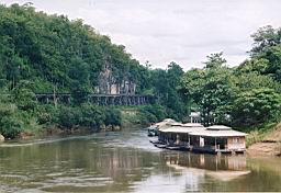 Mit dem Moped nahmen wir uns vor die nächsten Tage Richtung Sangkhlaburi zu fahren was nahe der burmesischen Grenze lag. Die Entfernung betrug ca. 220km. Die gesamte Strecke war durchgängig gut in Schuss (Asphalt) und es war nur sehr wenig Verkehr auf der Strecke.Die Straße führte durch eine paradiesisch grüne Hügellandschaft größtenteils entlang des "Kwae Yai/Nai Rivers"(khwae kwai) und es gab keine Touristen, die so wie wir unterwegs waren. Die Strecke versprach sehr interessant zu werden gab es doch allerhand Attraktionen laut der von Busterminal in Kanchanaburi verteilten Karte (kostenlose A4 2seitige s/w Kopie). Zuerst hofften wir eine Rundreise draus machen zu können - und eine der gepunkteten Pisten entlang des