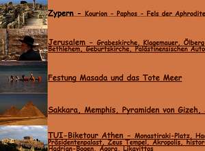 Besuchte Sehenswürdigkeiten / Keywörter: Zypern - Kourion - Paphos - Fels der Aphrodite Jerusalem - Grabeskirche, Klagemauer, Ölberg, Kirche aller Nationen, Bethlehem, Geburtskirche, Palästinensischen Autonomiegebiet Festung Masada und das Tote Meer Sakkara, Memphis, Pyramiden von Gizeh, Sphinx von Gizeh TUI-Biketour Athen - Monastiraki-Platz, Hadriansbibliothek Präsidentenpalast, Zeus Tempel, Akropolis, historische Olympiastadion, Hadrian-Bogen, Agora, Likavittos